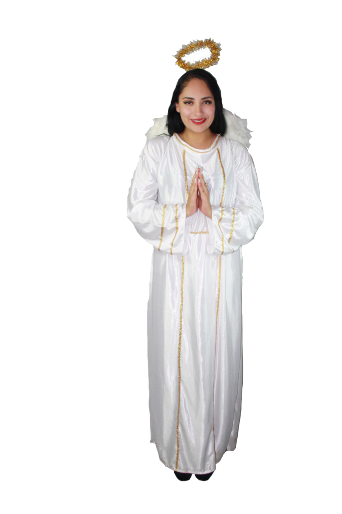Angel Mujer es un traje blanco con adornos dorados que incluye unas alas blancas de 40cm x 30cm. Ideal para lucir en obras de teatro o eventos familiares. Disfruta de un look mágico y celestial con Angel Mujer.
