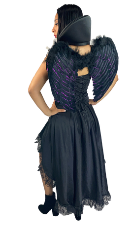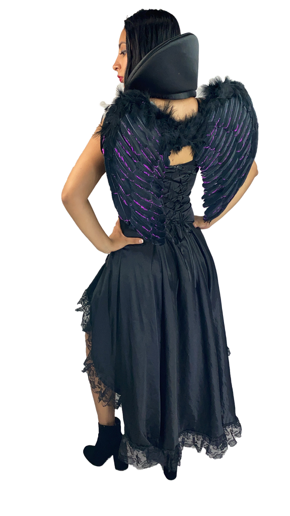 "Disfruta de una presencia imponente con nuestro disfraz de Angel Negro. El vestido de exelente costura y alas negras de 80cm x 60cm te harán destacar en cualquier fiesta de disfraces. Hazte con uno ahora y sorprende a todos con tu elegancia y misterio."