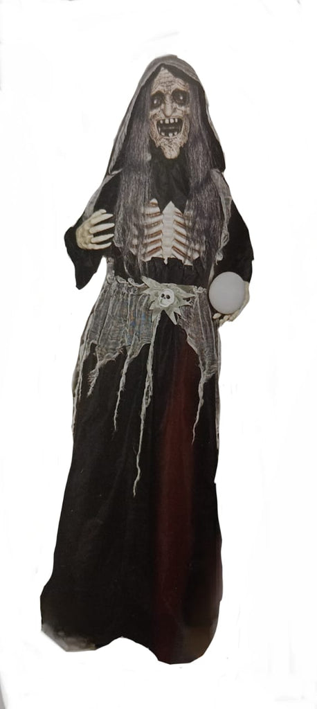 ¡Cuidado con esta bruja plateada animatrónica! Con su acabado aterrador, sensor de movimiento y sonido, ¡será la sensación de cualquier fiesta! Mide 172 cm y ¡te hará gritar de miedo! ¡No te arrepentirás de tenerla en tu colección de decoración de Halloween!