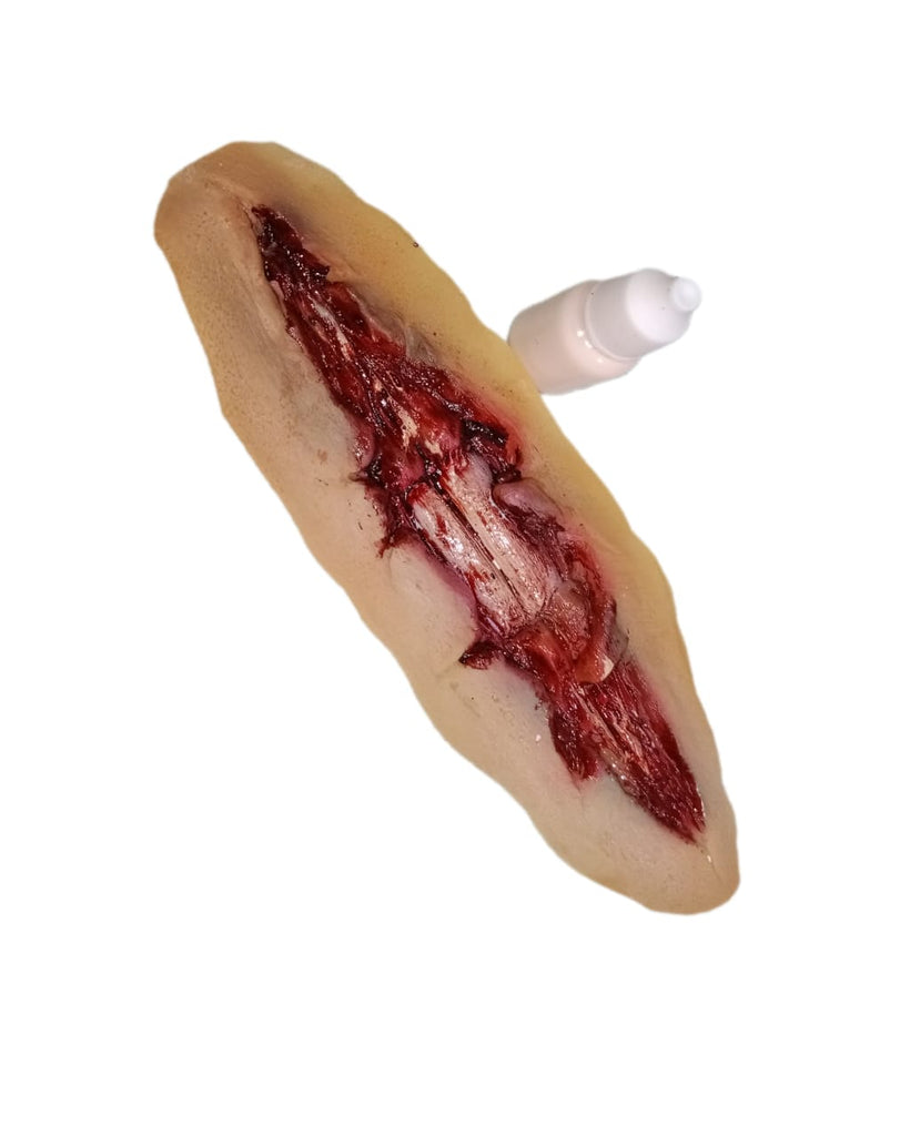 Esta herida es perfecta para ser el terror de todos lados. Incluye latex para un mayor realismo y dar un susto de muerte. ¡Provoca miedo y sorprende a todos con esta cicatriz!