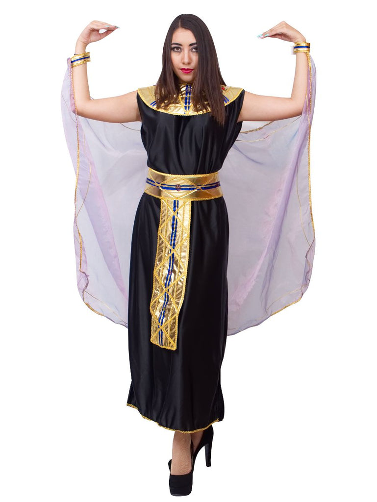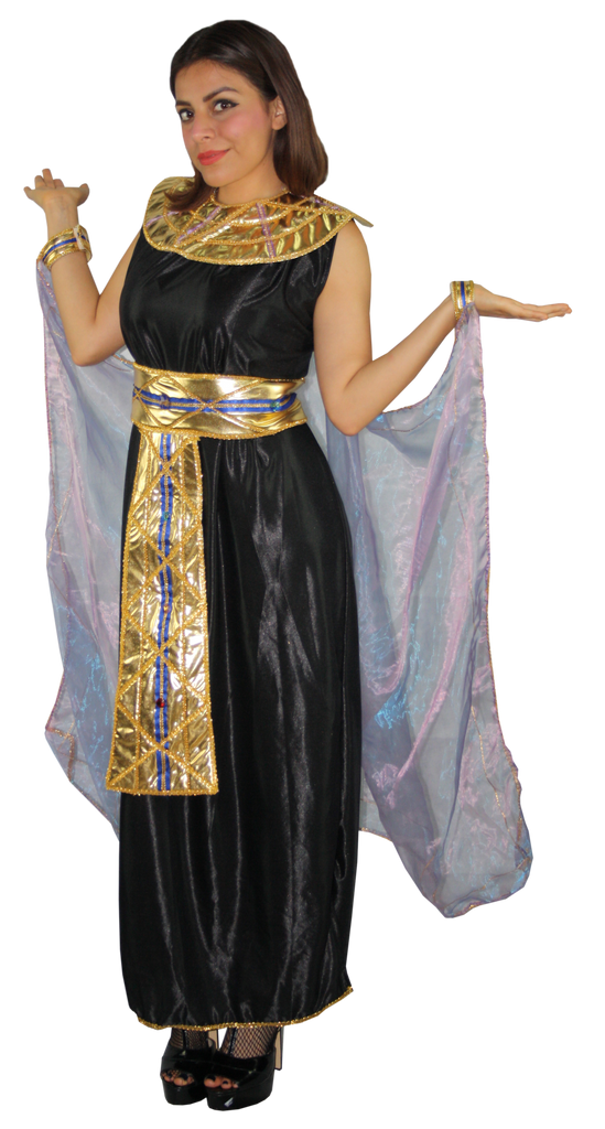 ¡Conviértete en la reina de la noche con nuestro disfraz de egipcia! Este consta de un vestido negro largo con velo, pulseras y cinturón de piedras, y un collar elegante. Disponible en todas las tallas. ¡Corre y consigue el tuyo!