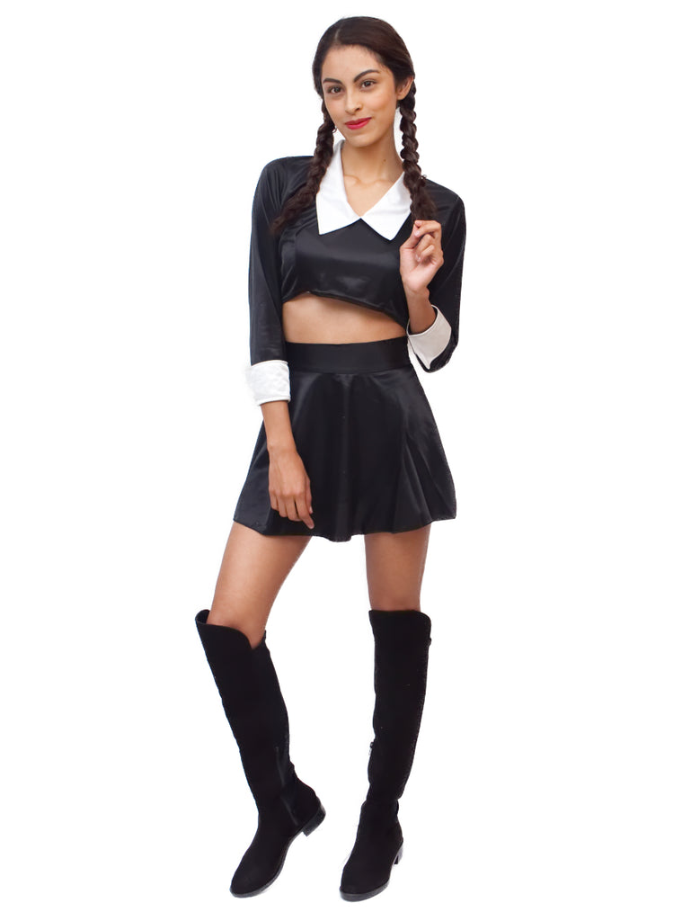 Con nuestra Gótica Sexy, estarás lista para cualquier fiesta temática o de Halloween. Consta de una minifalda negra y un crop top de manga larga con cuello blanco. Serás la diva del evento y no podrás pasar desapercibida. Disponible en varias tallas para que te veas ¡bonita y divina!