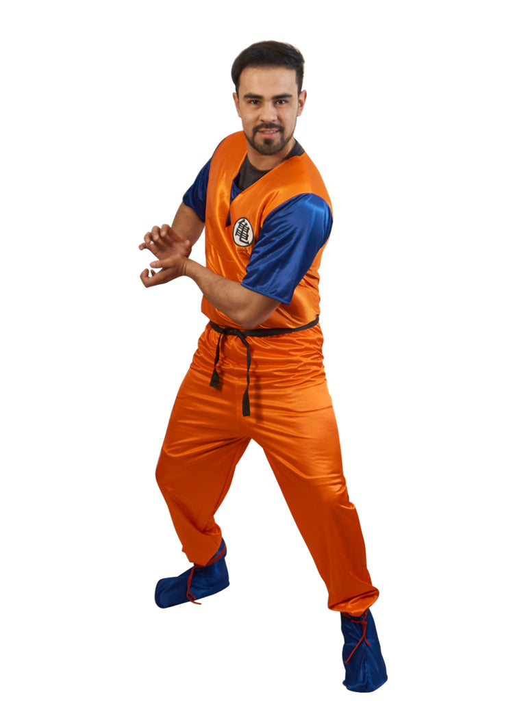 ¡Conviértete en el héroe más poderoso con Guerrero Sayayin! Este traje incluye un pantalón y playera naranja con mangas azules y una cinta para un efecto más realista. Perfecto para cualquier evento, desde cumpleaños hasta Halloween. Disponible en tallas para bebés, niños y adultos. ¡Sé el centro de atención con este juego de disfraces único y divertido!