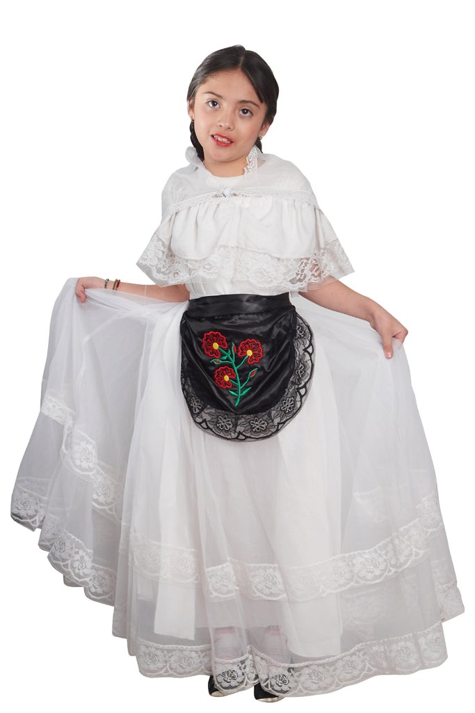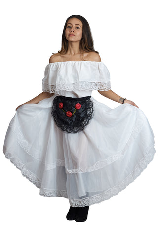 ¡Saca tu jarocha interior con este hermoso traje regional! El vestido con detalles de encaje y el mandil bordado reflejan las tradiciones y costumbres de México. Disponible en todas las tallas, ¡lleva un pedacito de tu país contigo!