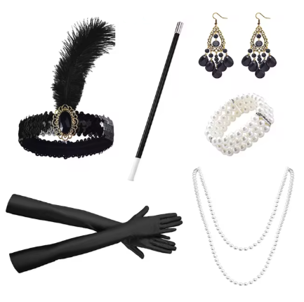 ¡Con el kit Charleston Deluxe, serás el centro de atención! Este completo kit de excelente calidad incluye una pulsera, un collar, guantes, aretes, una tiara y un cigarro para darle vida a tu traje. ¡Perfecto para resaltar en cualquier evento!