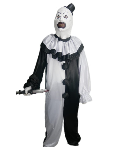 ¡Prepárate para dar miedo con nuestro Payaso Siniestro! Consta de un mameluco completo en blanco y negro que le da un toque terrorífico a tu disfraz. Disponible en todas las tallas, desde infantil hasta adulto. ¡Causa terror a tu paso con este disfraz de payaso!