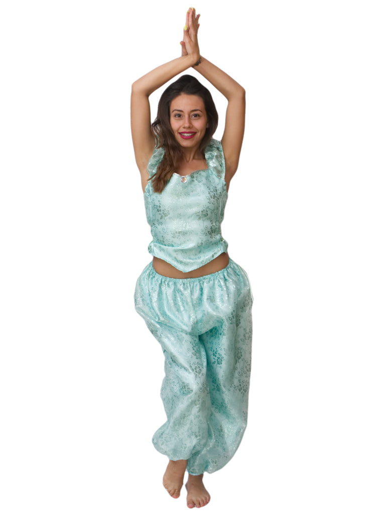Sé la Princesa Árabe con nuestro set de pantalón y crop top color menta con toques platas. Perfecto para ser el centro de atención en tus fiestas temáticas, cumpleaños o disfraces. Disponible en todos las tallas, infantil y adulta. ¡Diviértete y destaca con este conjunto!