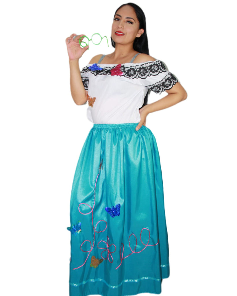 ¡Sé la princesa más bonita y la esperanza de todos con Princesa de la Esperanza! Este vestido presenta una falda color menta y una blusa blanca con toques de flores, disponible en tallas infantiles y adultas. ¡Perfecto para ser la más encantadora de la fiesta!