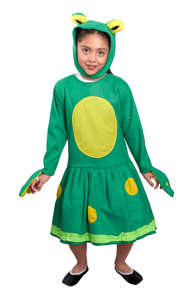 ¡Sé la Rana Mujer más fashion con este vestido verde de manga larga! Incluye capucha para un toque divertido y realista. Disponible en tallas infantiles. ¡Salta y juega con estilo!